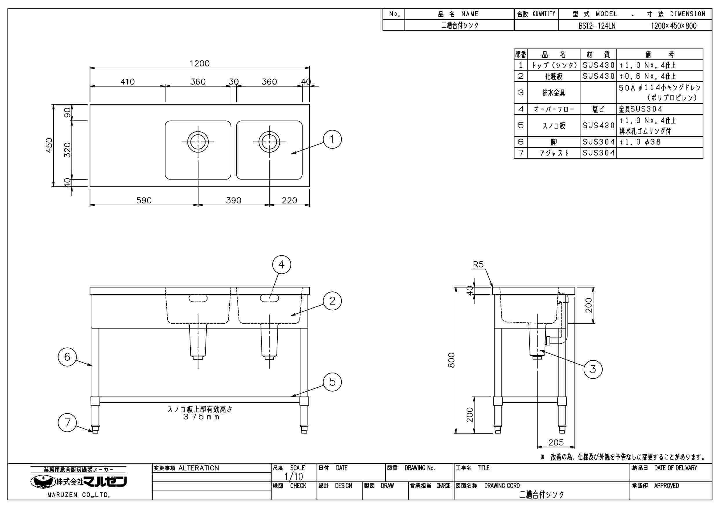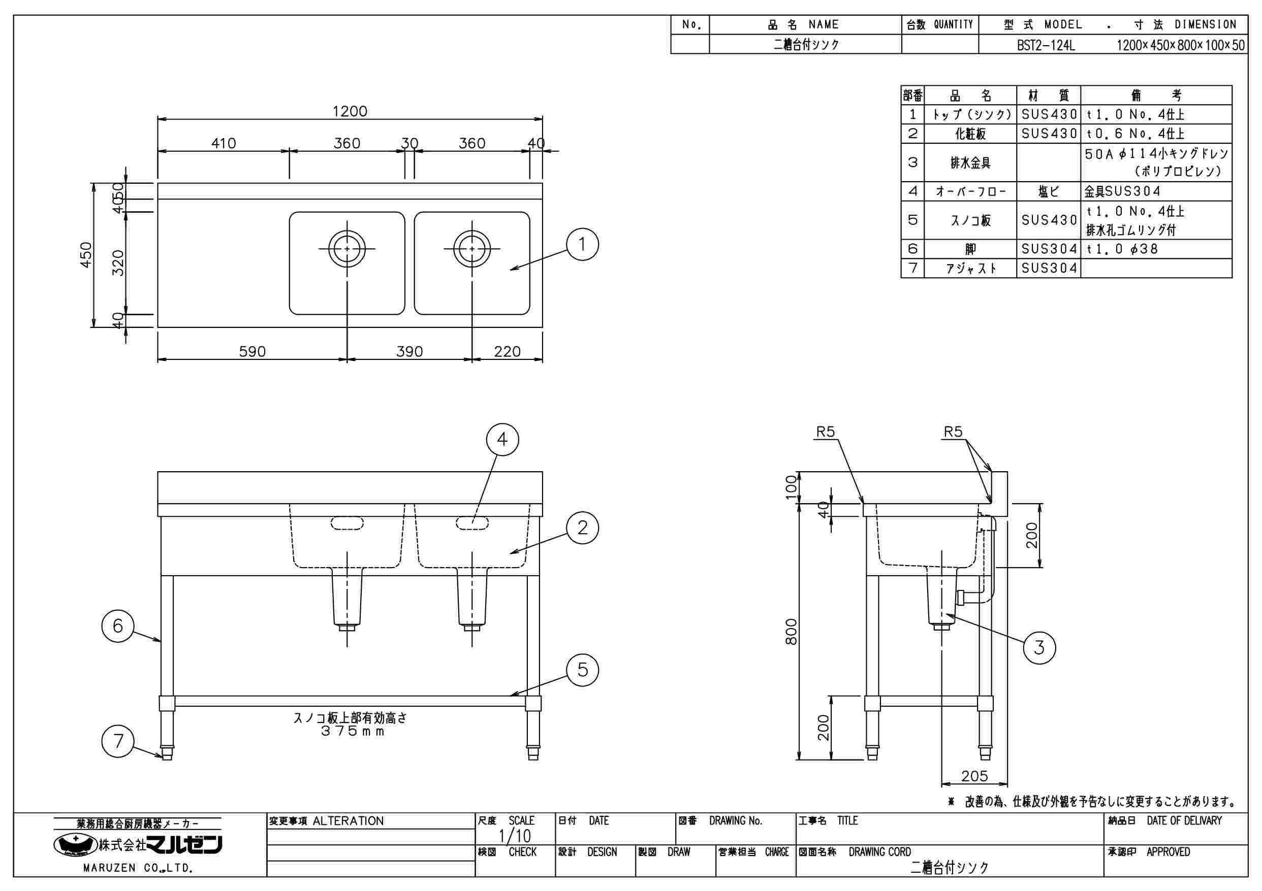 【3月末までのお届け分限定価格】BST2-124L,BST2-124LN【マルゼン】二槽台付シンク 幅1200×奥行450×高さ800mm