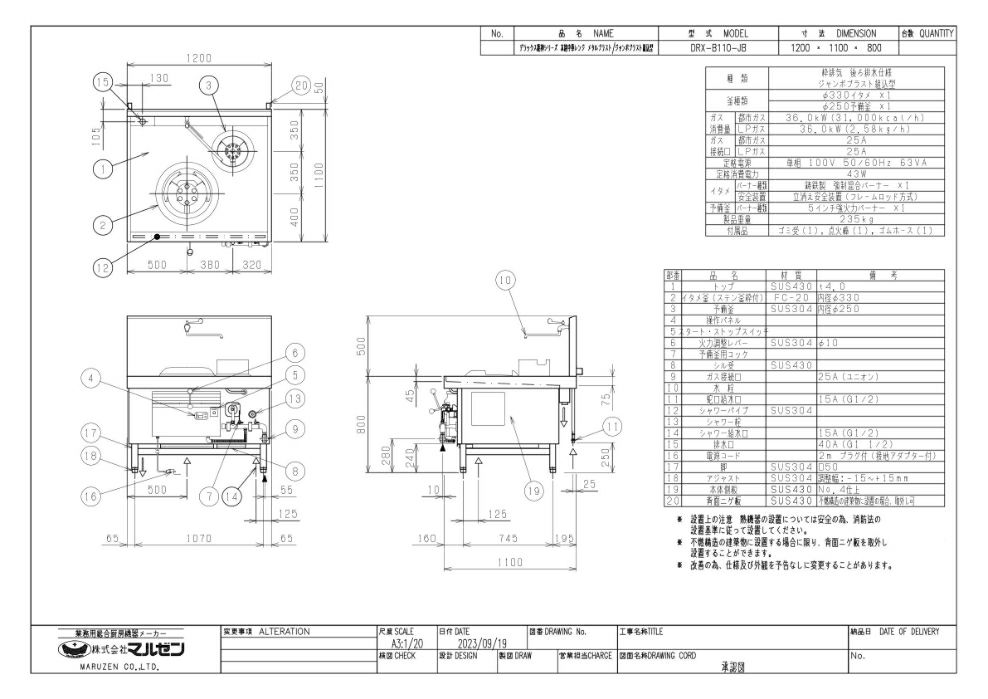 【マルゼン】中華レンジ ジャンボブラストバーナー DRX-B110-JB 幅1200×奥行1100×高さ800mm