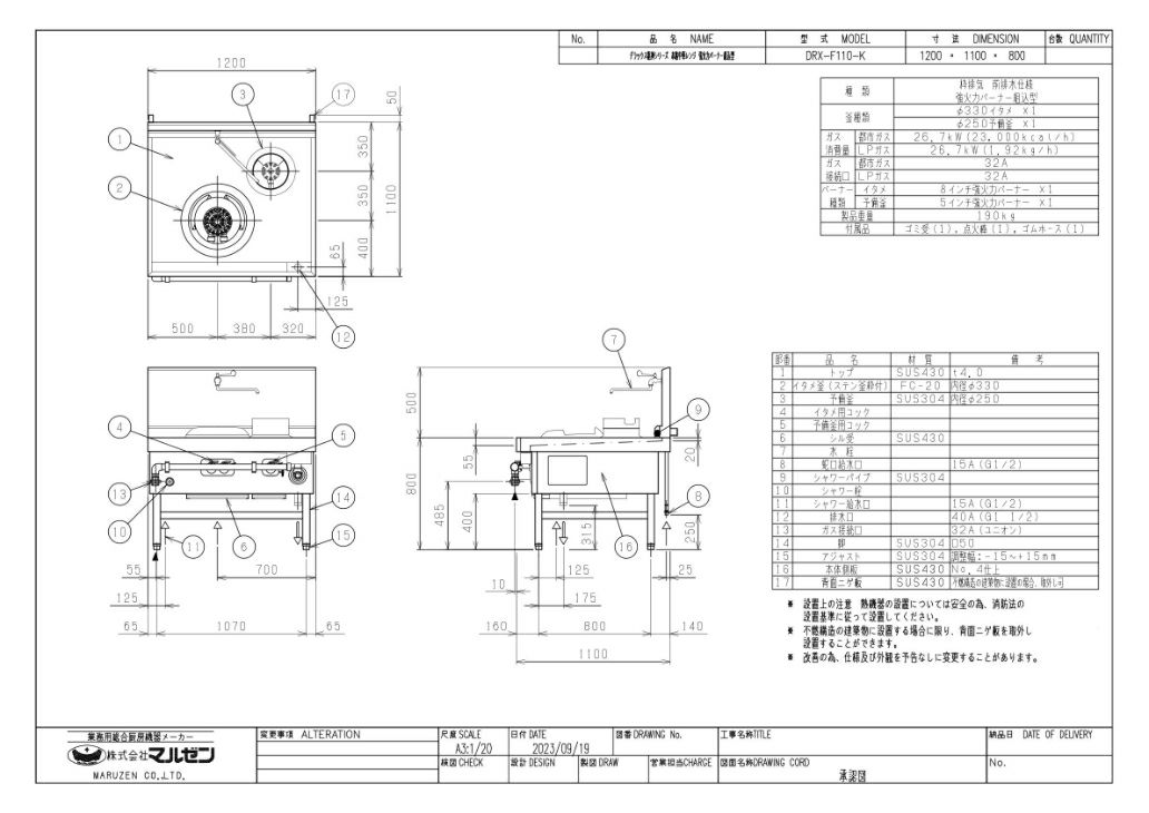 【マルゼン】中華レンジ 強火力バーナー DRX-F110-K 幅1200×奥行1100×高さ800mm