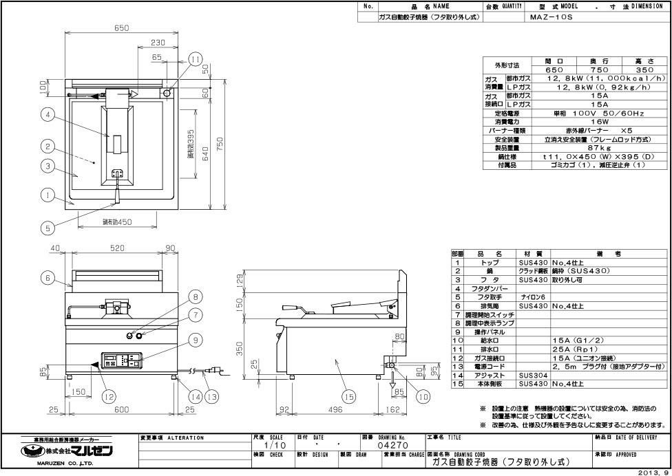 商品名:ガス自動餃子焼器 蓋取外し式 MAZ-10S