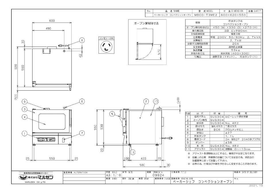 【マルゼン】貯水タンク式コンベクションオーブン MBCO-T3ME2, MBCO-T3MEL2 幅600×奥行620×高さ550mm