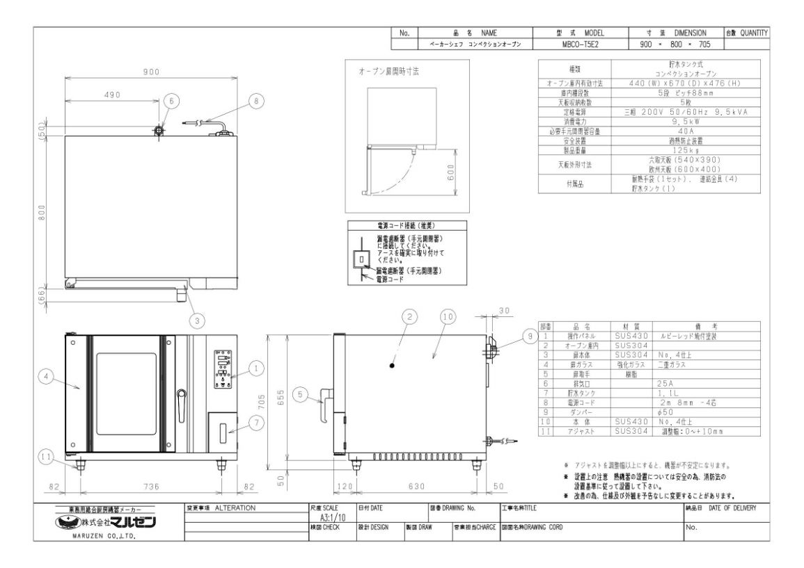【マルゼン】貯水タンク式コンベクションオーブン MBCO-T5E2(旧型式:MBCO-T5E, MBCO-T5EL)幅900×奥行800×高さ705mm