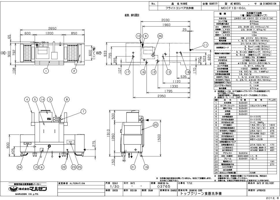 MDCF1B-6GL 【マルゼン】フライトコンベア洗浄機 幅2650×奥行900×高さ1910 三相200V 50/60Hz