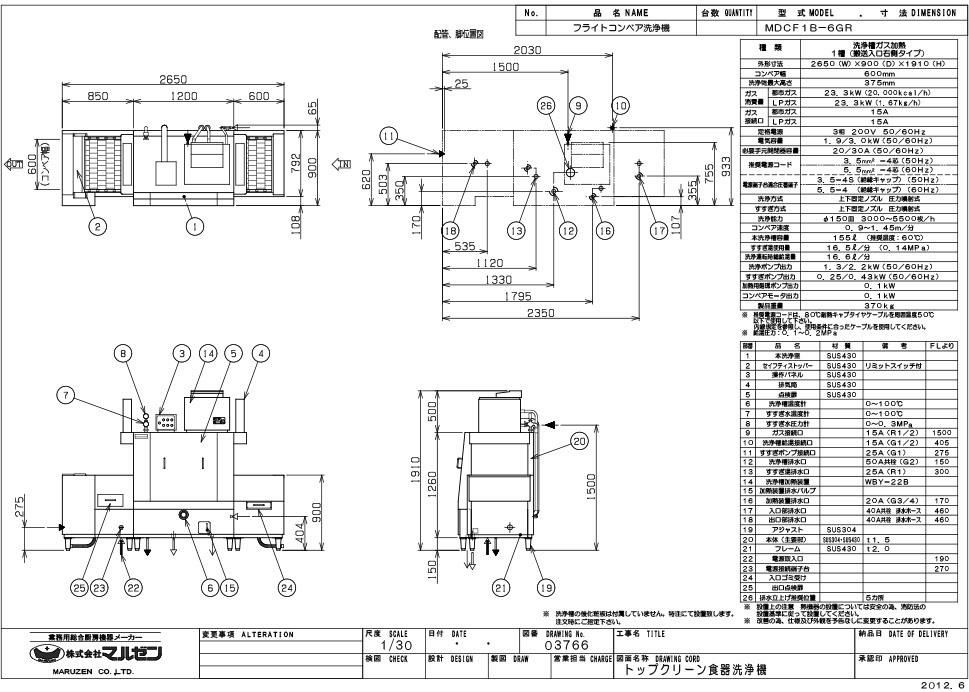 MDCF1B-6GR 【マルゼン】フライトコンベア洗浄機 幅2650×奥行900×高さ1910 三相200V 50/60Hz