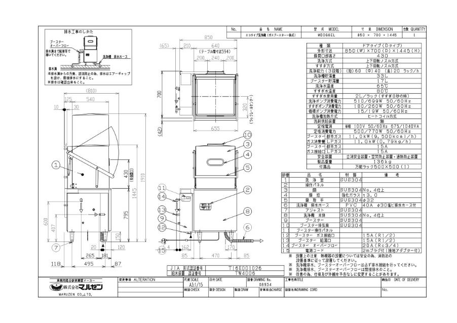 MDDG8EL 【マルゼン】食器洗浄機 エコタイプ 幅850×奥行700×高さ1445 単相100V 50/60Hz