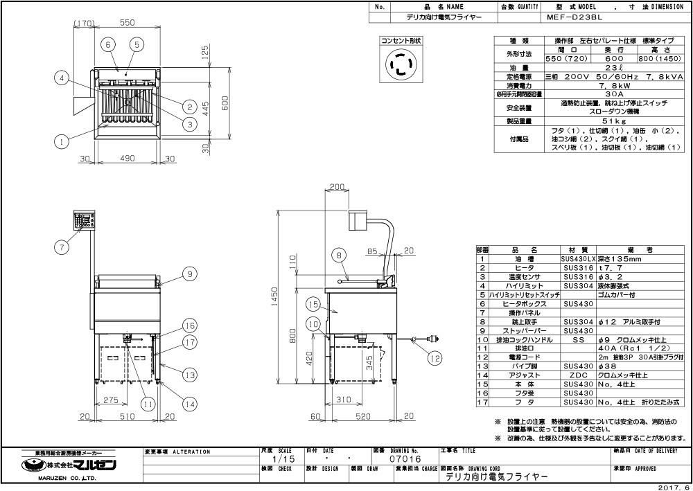 MEF-D23BL(R) 【マルゼン】 電気フライヤー デリカ向け 三相200V 幅550(720)×奥行600×高さ800(1450)