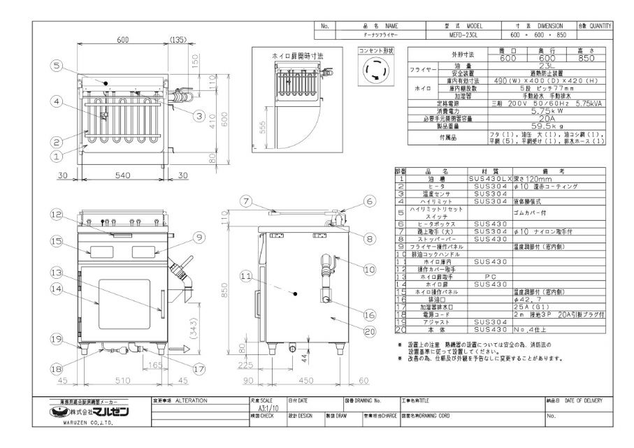 フライヤー:(油量)23L、(安全装置)過熱防止装置