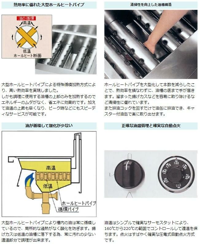 | 大型ホールヒートパイプにより槽内の油は常に循環しているので、局所的な過熱がなく酸化を防ぎます。揚げカスは低温の油槽に落下する為、常に汚れの少ない適温部分で調理が出来ます。 | 油温はシンプルで確実なサーモスタットにより、160℃から220℃の範囲でコントロールして適温を保ちます。点火はすばやく確実な圧電式自動点火方式です。 | |
