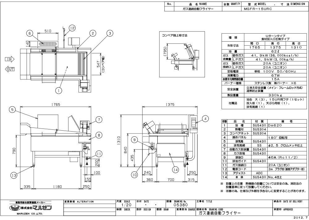 MGFR-15URC 【マルゼン】 ガス連続自動フライヤー 単相 100V 50/60Hz 幅1765×奥行1375×高さ1310