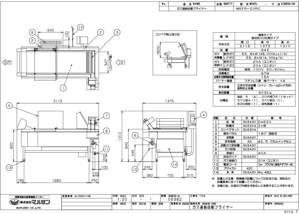 MGFR-20RC 【マルゼン】 ガス連続自動フライヤー 単相 100V 50/60Hz 幅2115×奥行1375×高さ1310