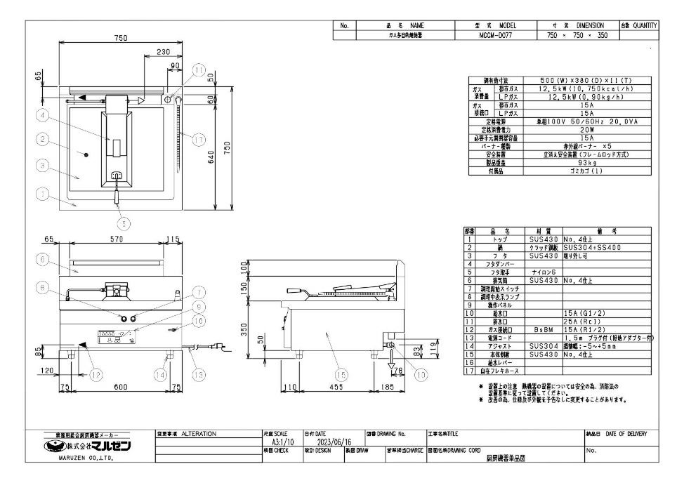 【マルゼン】ガス多目的焼物器 デリカ向け MGGM-D077 幅750×奥行750×高さ350 単相100V