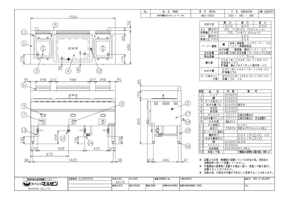 【マルゼン】ガスウォーマーテーブル ゆがき槽付 MGS-156CX 幅1500×奥行600×高さ800mm
