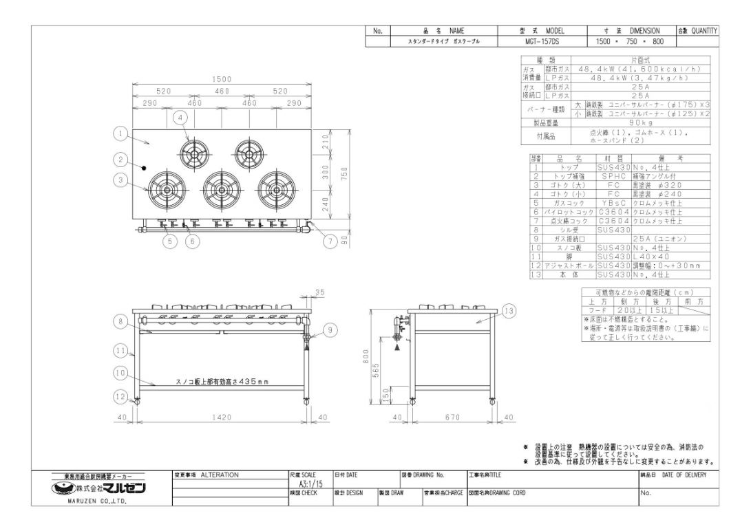 【マルゼン】ガステーブル STタイプ MGT-157DS 幅1500×奥行750×高さ800