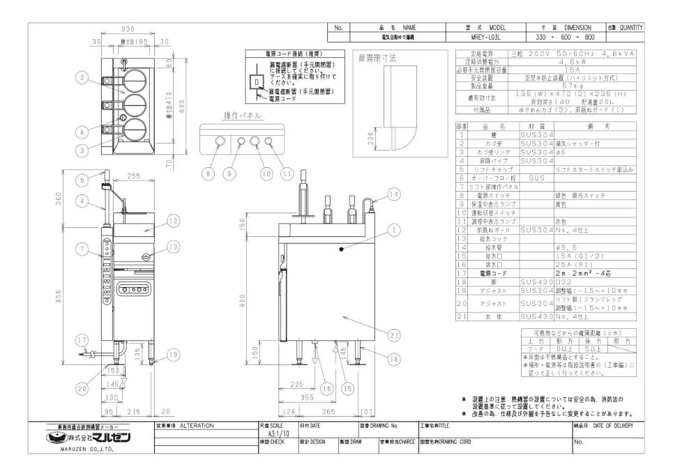 【マルゼン】電気自動ゆで麺機 MREY-L03L, MREY-L03R 幅330×奥行600×高さ800mm