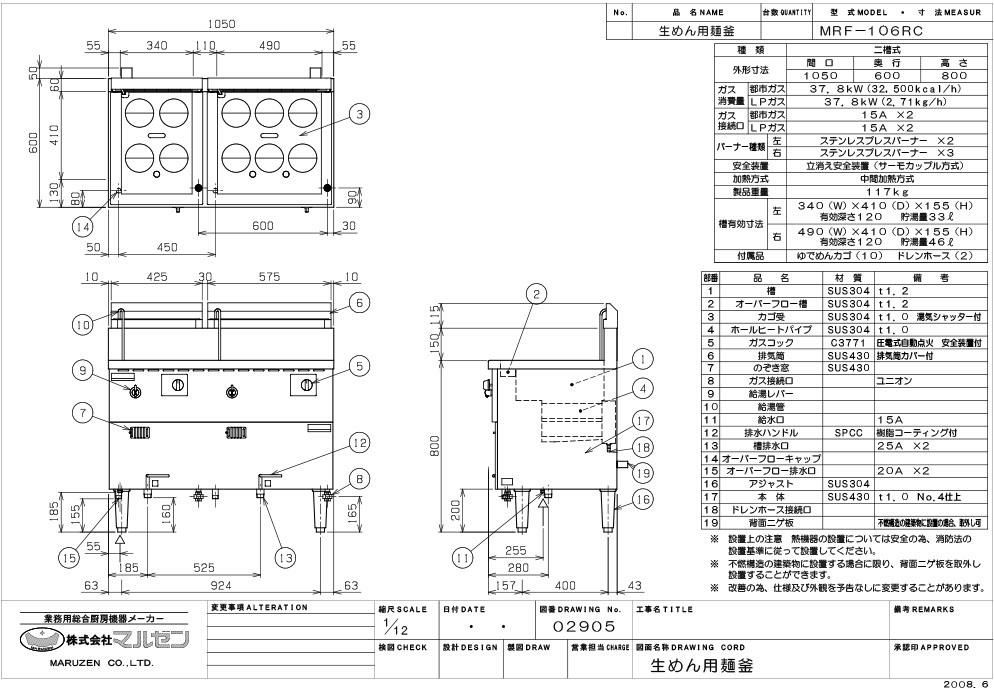 【マルゼン】生めん用釜 ゆで麺機 MRF-106RC 幅1050×奥行600×高さ800mm