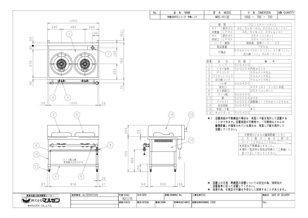 商品名:中華レンジ スタンダードタイプ 2口レンジ サイドガード付 W1050×D750×H720