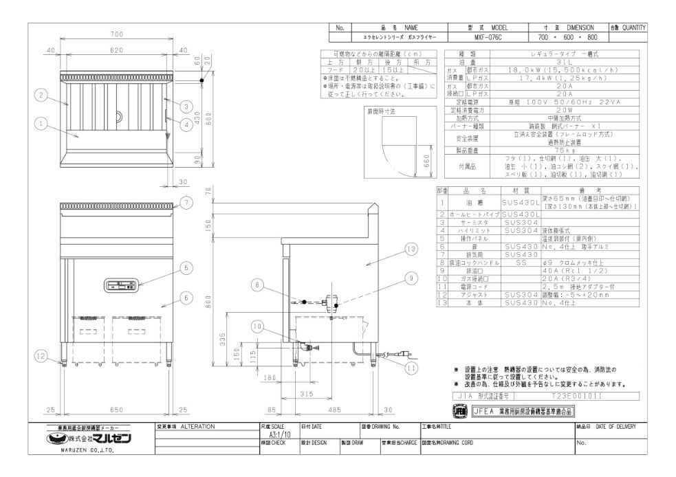 MXF-076C 【マルゼン】 ガスフライヤー 一槽式 単相100V 幅700×奥行600×高さ800