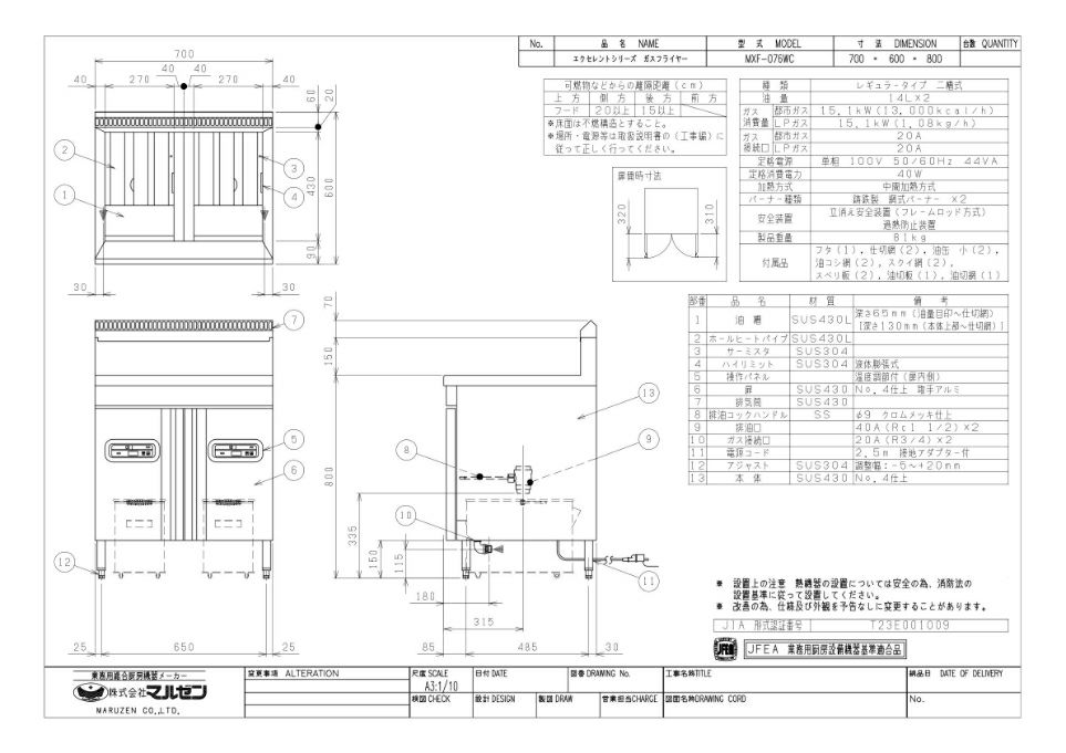 MXF-076WC 【マルゼン】 ガスフライヤー 二槽式 単相100V 幅700×奥行600×高さ800
