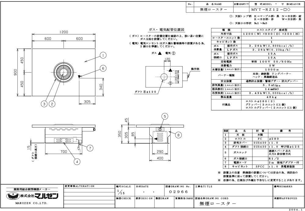 【マルゼン】無煙ロースター ロストル仕様 MYT-RZ12 幅1200×奥行900×高さ350 単相100V 50/60Hz