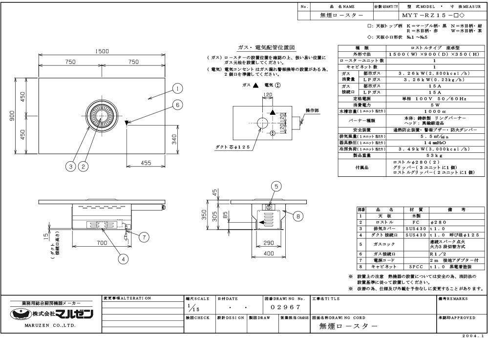 【マルゼン】無煙ロースター ロストル仕様 MYT-RZ15 幅1500×奥行900×高さ350 単相100V 50/60Hz