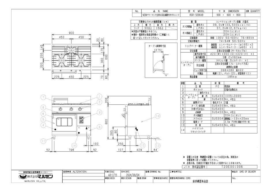 【マルゼン】ガスレンジ 3口 NEWパワークック RGR-S096XB(旧:RGR-S096X) 幅900×奥行600×高さ800mm