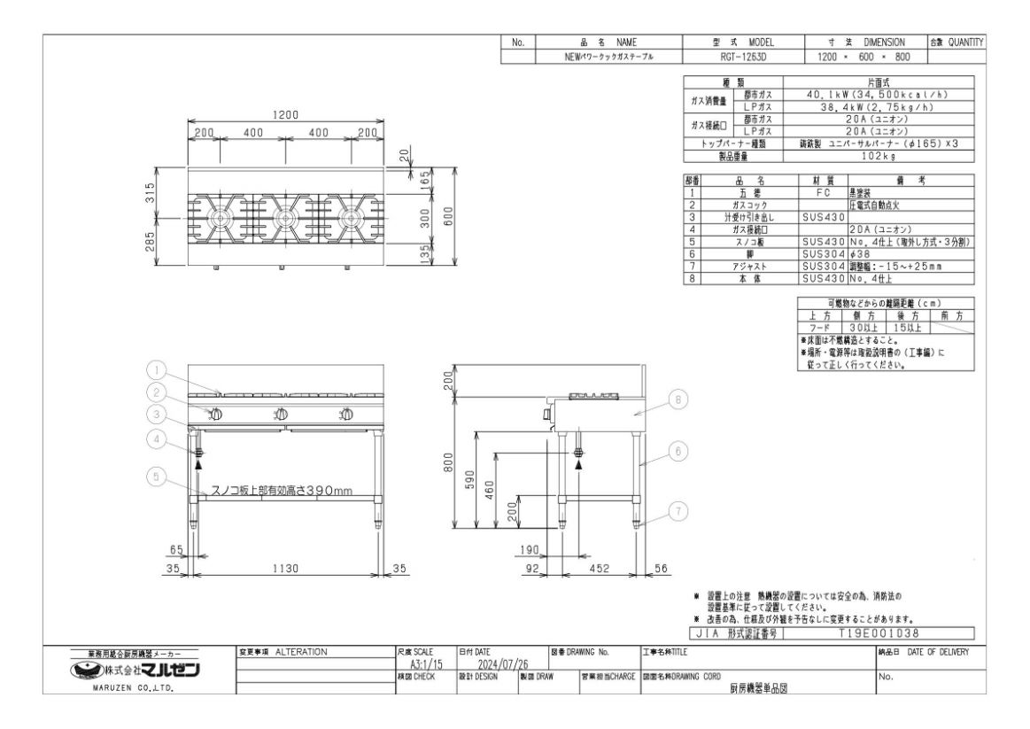 ガス消費量:都市ガス:40.1kW(34,500kcal/h)、LPガス(プロパン):38.4kW(2.75kg/h)