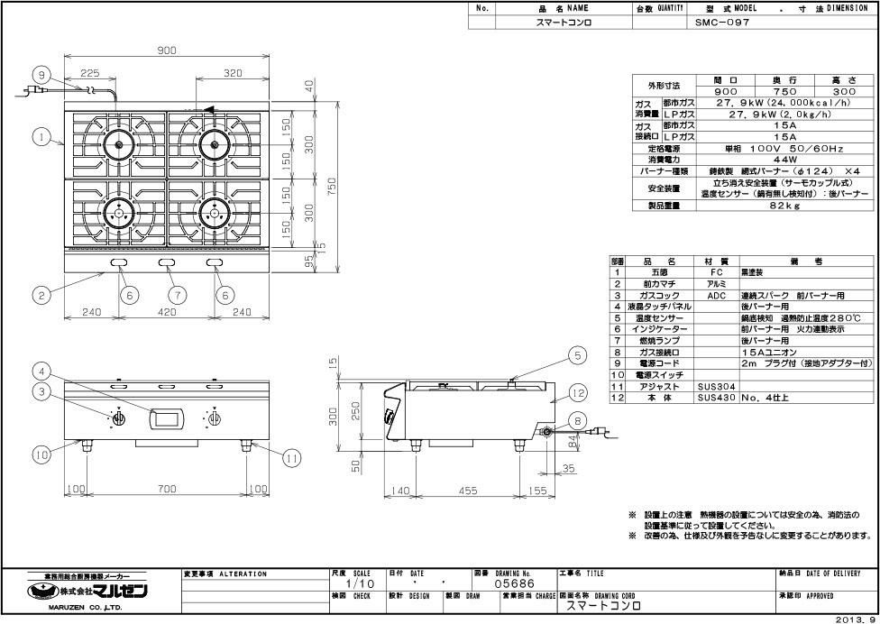 【マルゼン】スマートコンロ SMC-097 幅900×奥行750×高さ300 単相100V 50/60Hz