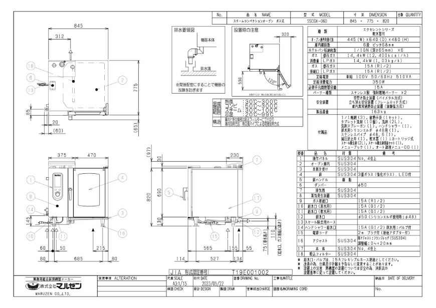 付属品:1/1焼網(3)、耐熱手袋(1セット)、タブレット(固形)洗剤(10個)、液体洗剤(2L)、洗剤スプレーガン(1)、ハンドシャワー(1)、減圧逆止弁(1)、排水用シリコンエルボφ48用(1)、ステンレスパイプφ48.6(1)、メニューブック、オート調理用メニューCD、軟水器(1)、スケール除去剤(2L)