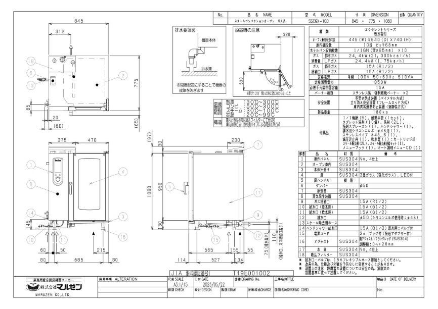 付属品:1/1焼網(5)、耐熱手袋(1セット)、タブレット(固形)洗剤(10個)、液体洗剤(2L)、洗剤スプレーガン(1)、ハンドシャワー(1)、減圧逆止弁(1)、排水用シリコンエルボφ48用(1)、ステンレスパイプφ48.6(1)、メニューブック、オート調理用メニューCD、軟水器(1)、スケール除去剤(2L)