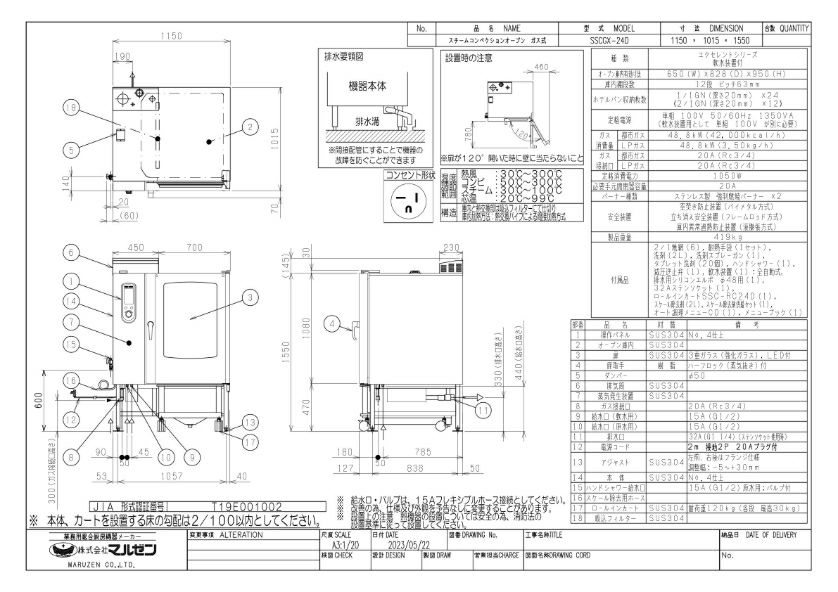 付属品:2/1焼網(6)、耐熱手袋(1セット)、液体洗剤(2L)、洗剤スプレーガン(1)、タブレット(固形)洗剤(20個)、ハンドシャワー(1)、減圧逆止弁(1)、排水用シリコンエルボφ48用(1)、32Aステンソケット(1)、ロールインカートSSC-RC24D(1)、メニューブック、オート調理用メニューCD、全自動軟水器(1)、スケール除去剤(2L)