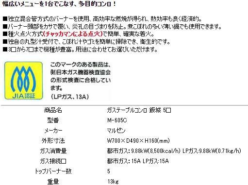 M-605C 【マルゼン】ガステーブルコンロ <飯城> 幅700×奥行490×高さ160