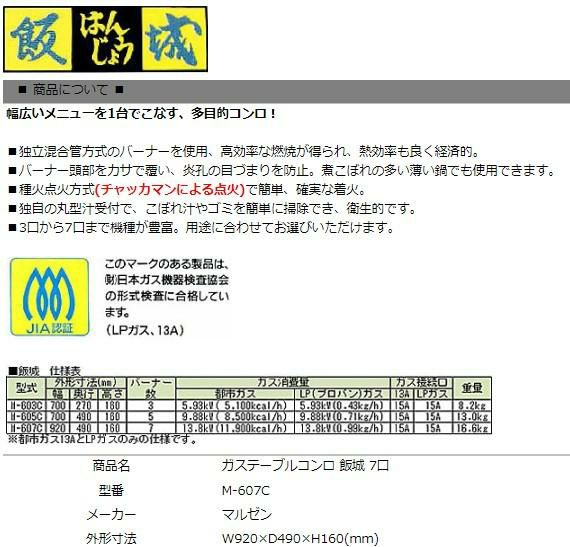 M-607C 【マルゼン】ガステーブルコンロ <飯城> 幅920×奥行490×高さ160