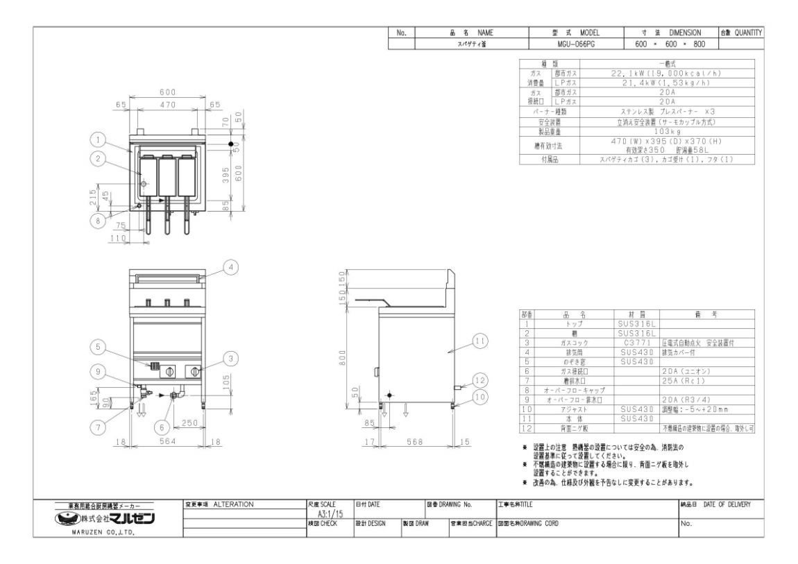 | ■ 商品概要 ■ | | 商品名 | スパゲティ釜 (ゆで麺器、ゆで麺機) | | 外形寸法 | 幅600×奥行600×高さ800(バック高さ150 )(mm) | | メーカー | マルゼン | | 型式 | MGU-066PG | | 電源 | - | | 消費電力 | - | | コンセントプラグ | - | | 内寸法/内容積 | - | | ガス消費量 | 都市ガス:22.1kW(19,000kcal/h)、LPガス:21.4kW(1.53kg/h) | | ガス接続口 | 都市ガス:20A、LPガス:20A | | 重量 | 103kg | | 付属品 | スパゲティカゴ、カゴ受け | | 特記事項 | ●調理能力:1回12食、60食/h ※能力の計算方法は乾麺1食100g、1回ゆで時間12分とした場合 ●槽の数:1 ●カゴの数:3 ●槽の水量:58L ●カゴに入る量:400g(4食分) ●排水口:25A・20A | ※ご注文の際にガス種をお選びください。 ※ガス機器の接続は、最寄のガス専門業者へご依頼ください。 |