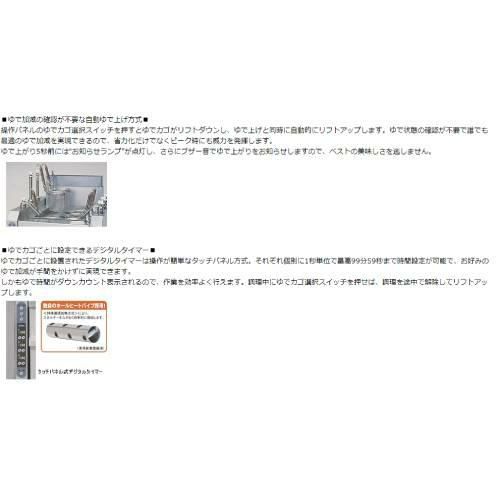 ■ゆで加減の確認が不要な自動ゆで上げ方式■ 操作パネルのゆでカゴ選択スイッチを押すとゆでカゴがリフトダウンし、ゆで上げと同時に自動的にリフトアップします。ゆで状態の確認が不要で誰でも最適のゆで加減を実現できるので、省力化だけでなくピーク時にも威力を発揮します。 ゆで上がり5秒前には“お知らせランプ”が点灯し、さらにブザー音でゆで上がりをお知らせしますので、ベストの美味しさを逃しません。
