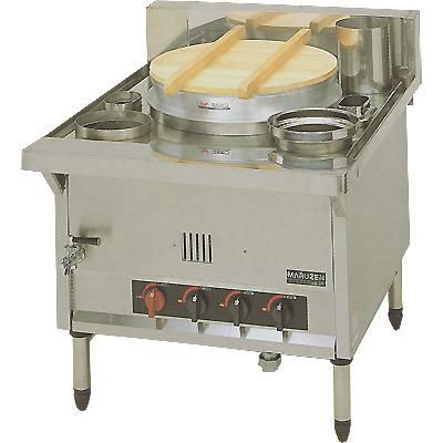 ・フィンの間を炎が蛇行するので熱の吸収力がすぐれた省エネタイプ。 ・フィン採用により湯が手前に集中して沸騰するので麺がうまく回転します。 ・噴流釜の回転状態は手前から後ろへ効果的に循環し、そばを適度にほぐしながらおいしくゆで上げます。 ・1度に最大15食ゆで上げができます。