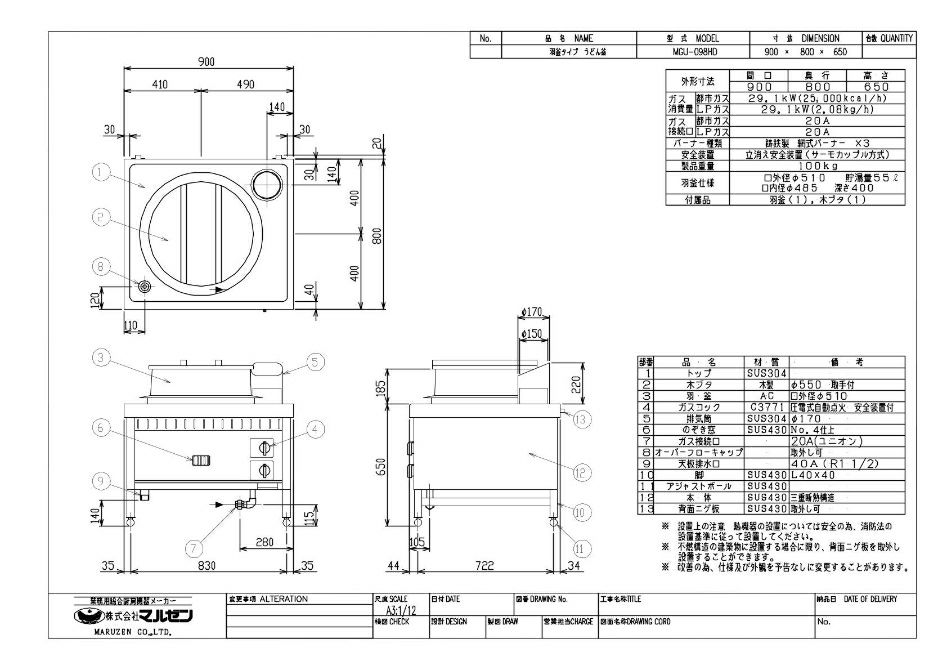 | 商品名 | うどん釜 羽釜タイプ(ゆで麺器、ゆで麺機) | | 型番 | MGU-098HD | | メーカー | マルゼン | | 外形寸法 | W900×D800(820)×H650(mm) |