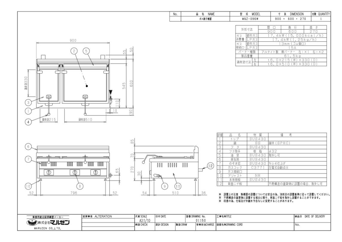 | 商品名 | ガス餃子焼器 スタンダードシリーズ 2口鍋 W900×D600×H270 | | 型番 | MGZ-096W | | メーカー | マルゼン | | 外形寸法 | W900×D600×H270(mm) |