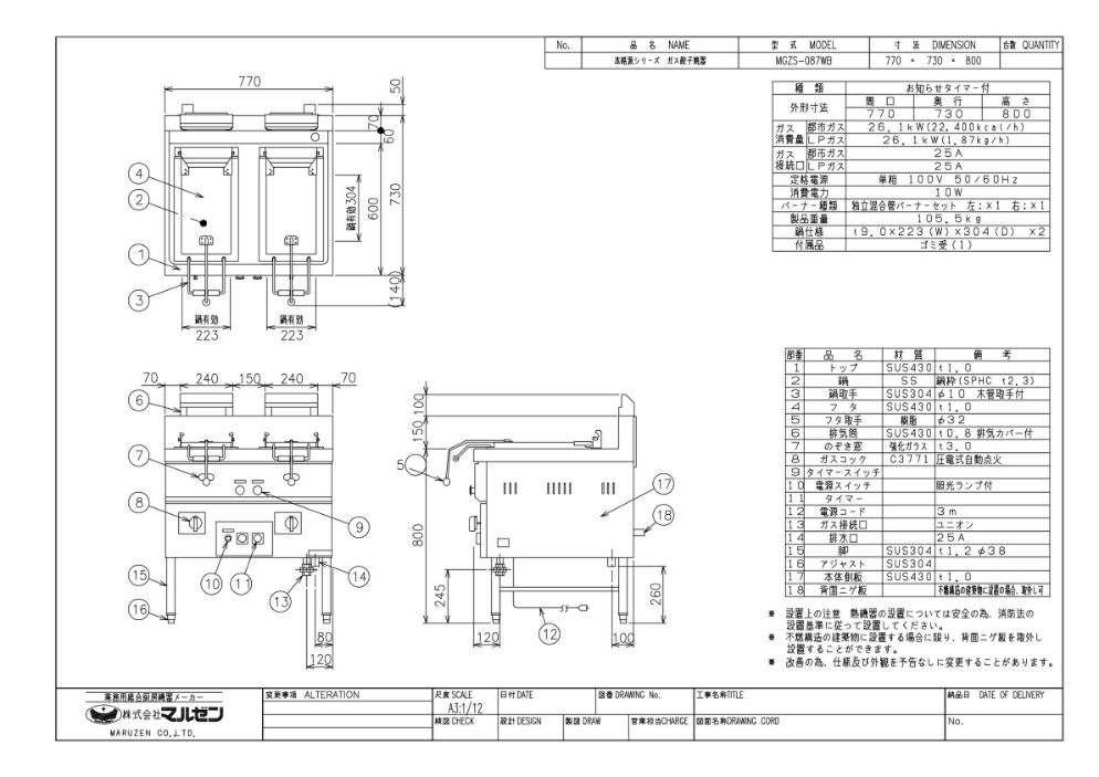 ●外形寸法:幅770×奥行750(730)×高さ800(mm) バック高さ150mm ●鍋寸法:幅223×奥行304(mm)×2 ●鍋数:2 ●焼き上がり能力:1回24個+24個、1時間あたり800個 ※1回の焼き上がり時間を3分30秒とした場合 ●ガス消費量:都市ガス 26.1kW(22,400kcal/h)、LPガス 26.1kW(1.87kg/h) ●ガス接続口(ユニオン):25A ●定格電源:単相100V 50/60Hz ●消費電力:10W ●排水口:25A ●重量:105.5kg |