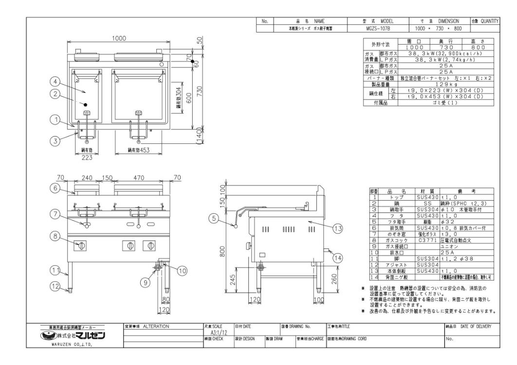| 商品名 | ガス餃子焼器 本格派シリーズ 2口鍋 W1000×D750×H800 | | 型番 | MGZS-107WB | | メーカー | マルゼン | | 外形寸法 | W1000×D750(730)×H800(mm) バックH150mm |