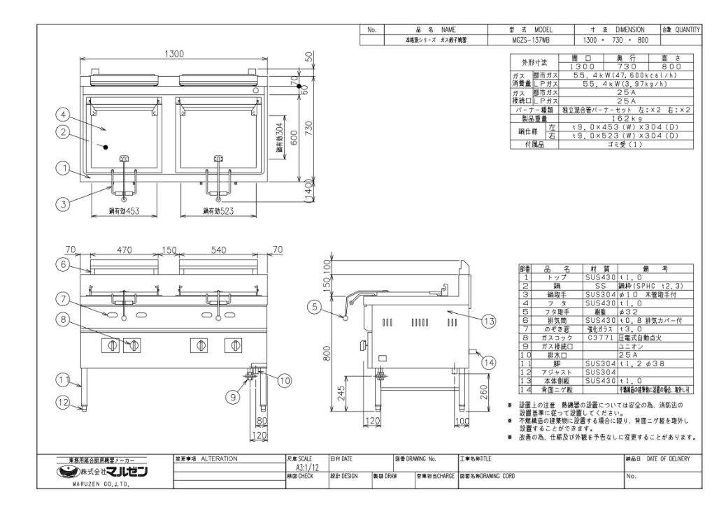 | 商品名 | ガス餃子焼器 本格派シリーズ 2口鍋 W1300×D750×H800 | | 型番 | MGZS-137WB | | メーカー | マルゼン | | 外形寸法 | W1300×D750(730)×H800(mm) バックH150mm |