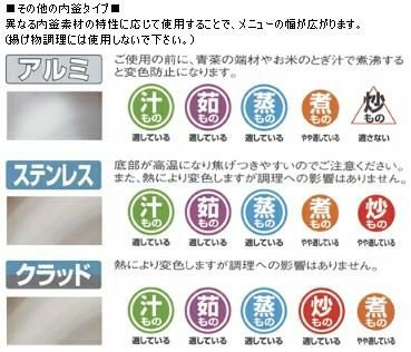 異なる内釜素材の特性に応じて使用することで、メニューの幅が広がります。