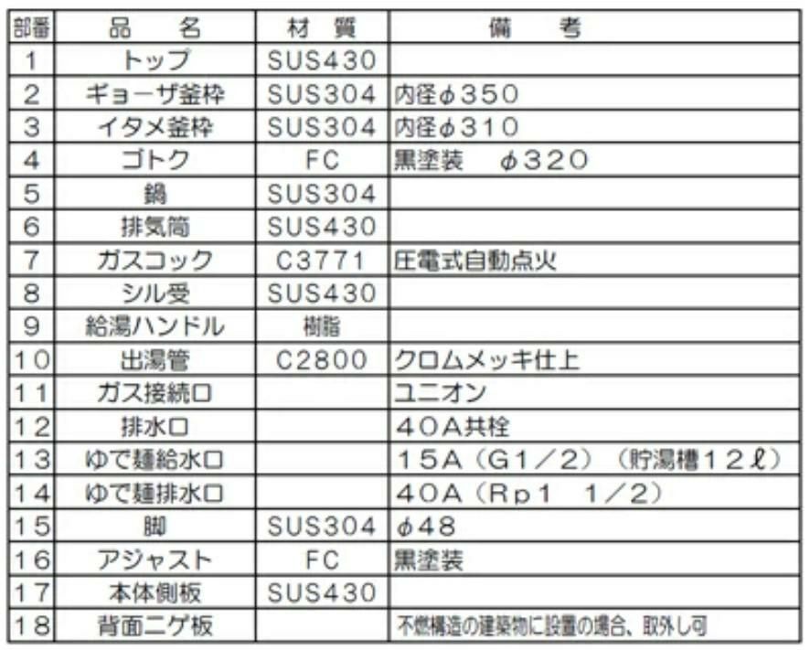 | タイプ | 型番 | 外形寸法 (mm) | 釜配置 | ガス消費量 | | 間口 | 奥行 | 高さ | 都市ガス (kcal/h) | LPガス (kg/h) | | 4口 | MR-504 | 2250 | 750 | 720 | ギョーザ、イタメ、スープ、ソバ | 57,000 | 4.75 | | MR-504D | 2250 | 750 | 720 | イタメ、イタメ、スープ、ソバ | 62,000 | 5.17 | | MR-514 | 2130 | 750 | 720 | ギョーザ、イタメ、イタメ、スープ | 50,000 | 4.17 | | MR-564 | 2250 | 750 | 720 | ギョーザ、イタメ、スープ、ゆで麺 | 58,500 | 4.88 | | 3口 | MR-503 | 1750 | 750 | 720 | イタメ、スープ、ソバ | 47,000 | 3.92 | | MR-513 | 1630 | 750 | 720 | ギョーザ、イタメ、スープ | 35,000 | 2.92 | | MR-563B | 1750 | 750 | 720 | イタメ、スープ、ゆで麺 | 48,500 | 4.04 | | 2口 | MR-502 | 1200 | 750 | 720 | イタメ、ソバ | 37,000 | 3.08 | | MR-562B | 1250 | 750 | 720 | スープ、ゆで麺 | 33,500 | 2.79 | | 1口 | MR-501 | 700 | 750 | 720 | ソバ | 22,000 | 1.83 | | MR-511 | 580 | 750 | 720 | イタメ | 15,000 | 1.25 |