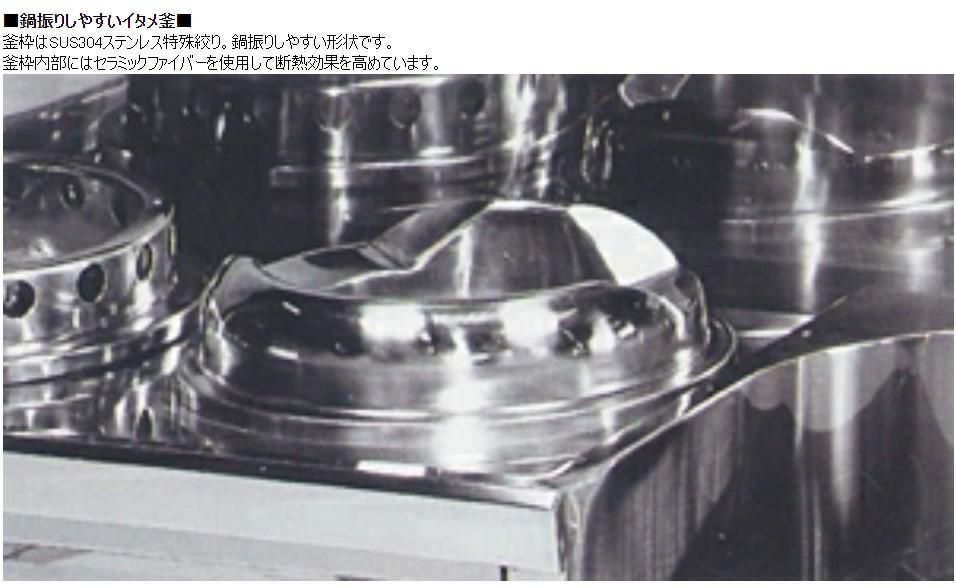 釜枠はSUS304ステンレス特殊絞り。内向きファイヤースクリーンバーナー採用で、