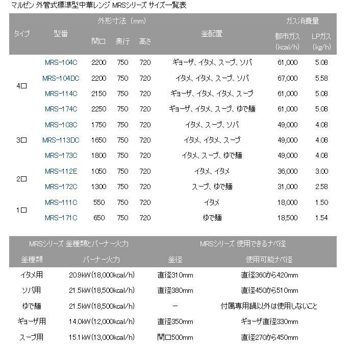 マルゼン 外管式標準型中華レンジ MRSシリーズ サイズ一覧表