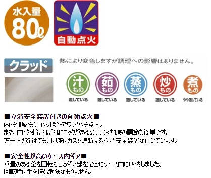 商品名:ガス回転釜 80L W1310×D917×H780 クラッド製 自動点火式