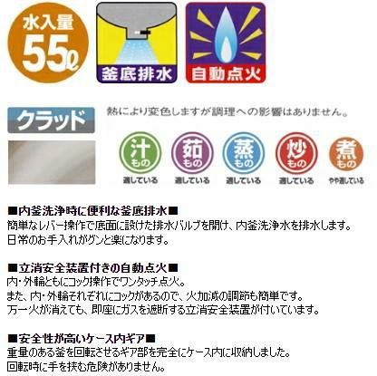 商品名:ガス回転釜 55L W1255×D862×H780 クラッド製 自動点火式 釜底排水付