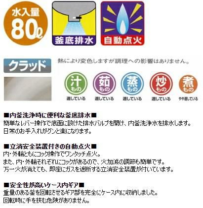 商品名:ガス回転釜 80L W1310×D917×H780 クラッド製 自動点火式 釜底排水付