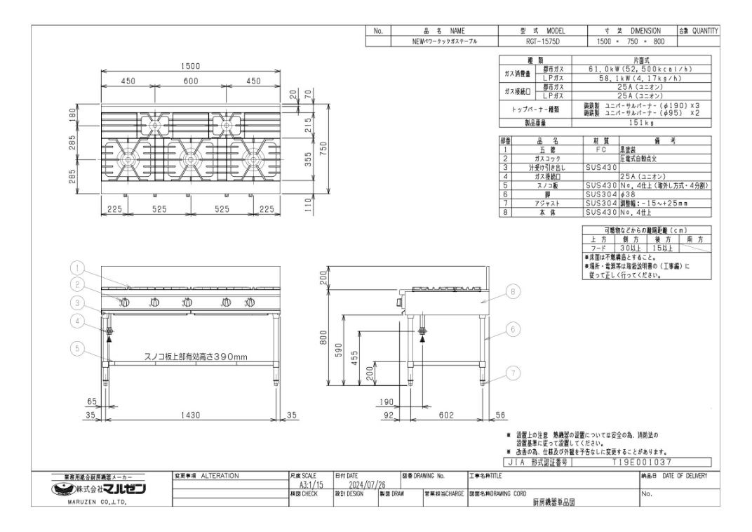 ●外形寸法:幅1500×奥行750×高さ800(mm) バックガード高さ:200mm ●使用面:片面式 ●トップバーナー数:直径190mm×3、直径95mm×2 ●ガス消費量:都市ガス 61.0kW(52,500kcal/h)、LPガス LP58.1kW(4.17kg/h) ●ガス接続口(ユニオン):25A ●重量:155kg |