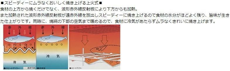 食材の上方から焼くだけでなく、波形赤外線反射板により下方からも加熱。