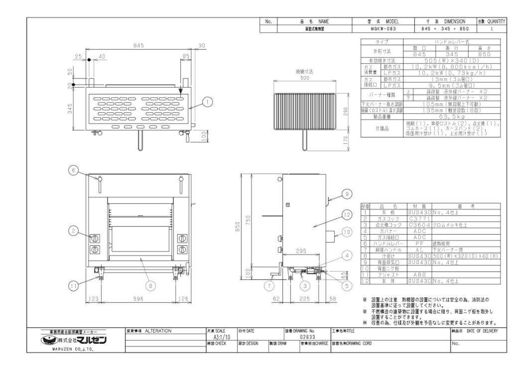 ●外径寸法:幅845×奥行345×高さ850(mm) ●庫内寸法:幅505×奥行340 ●ガス消費量:都市ガス:10.2kW(8,800kcal/h)、LPガス:10.2kW(0.68kg/h) ●ガス接続口:都市ガス:ゴム管口13mm、L3(4A、4B、4C)の場合は15A、LPガス:ゴム管口9.5mm ●下火バーナー高さ調節:無段階昇降ハンドル方式 ●重量:63.5kg ●付属品:汁受1、焼網1、串受ロストル2、点火棒1 |